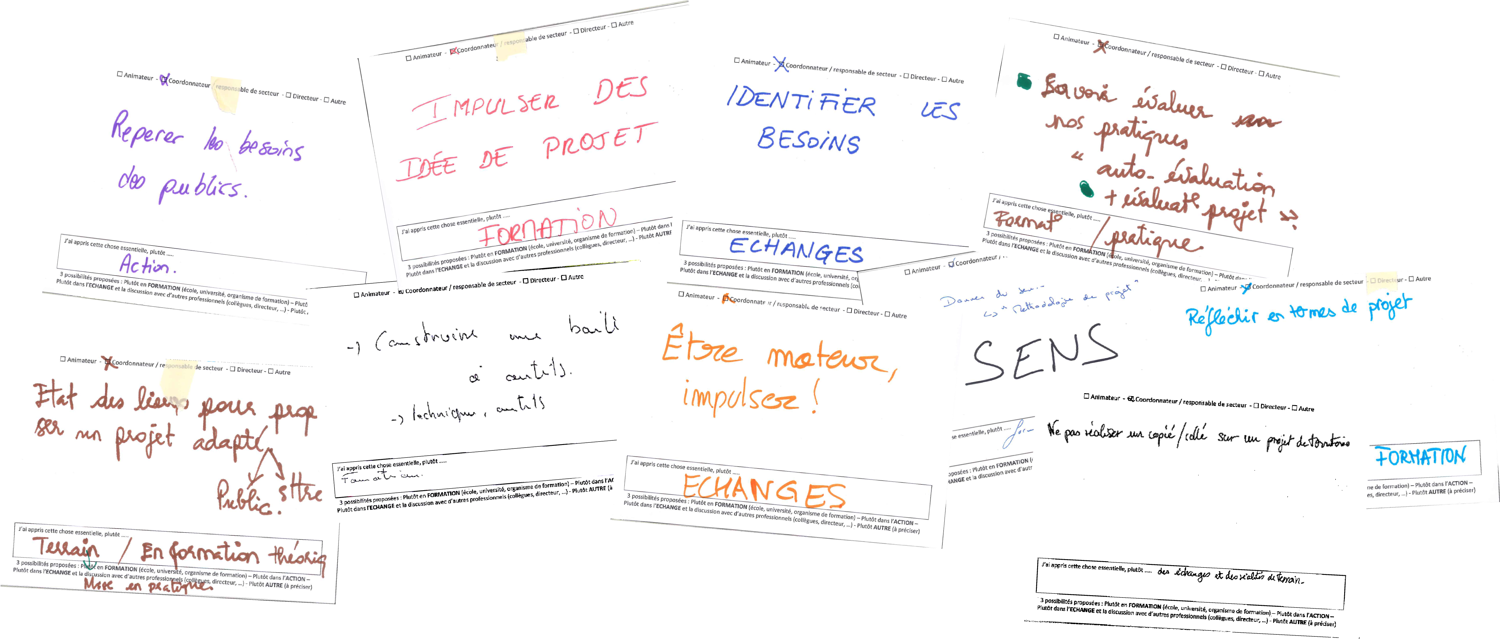 L'objectif de cet atelier est d'identifier les choses essentielles que l'on a apprises pour exercer son métier, et comment on les a apprises. L'exercice est effectué par groupe de trois, puis les productions sont réunies par métier.